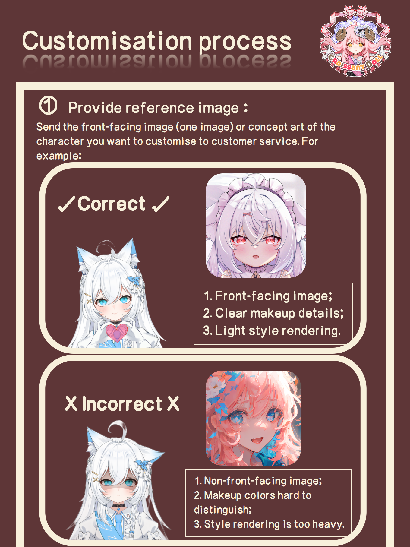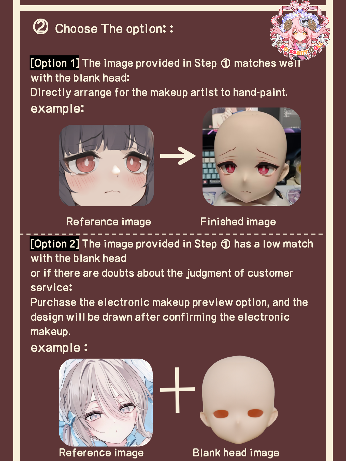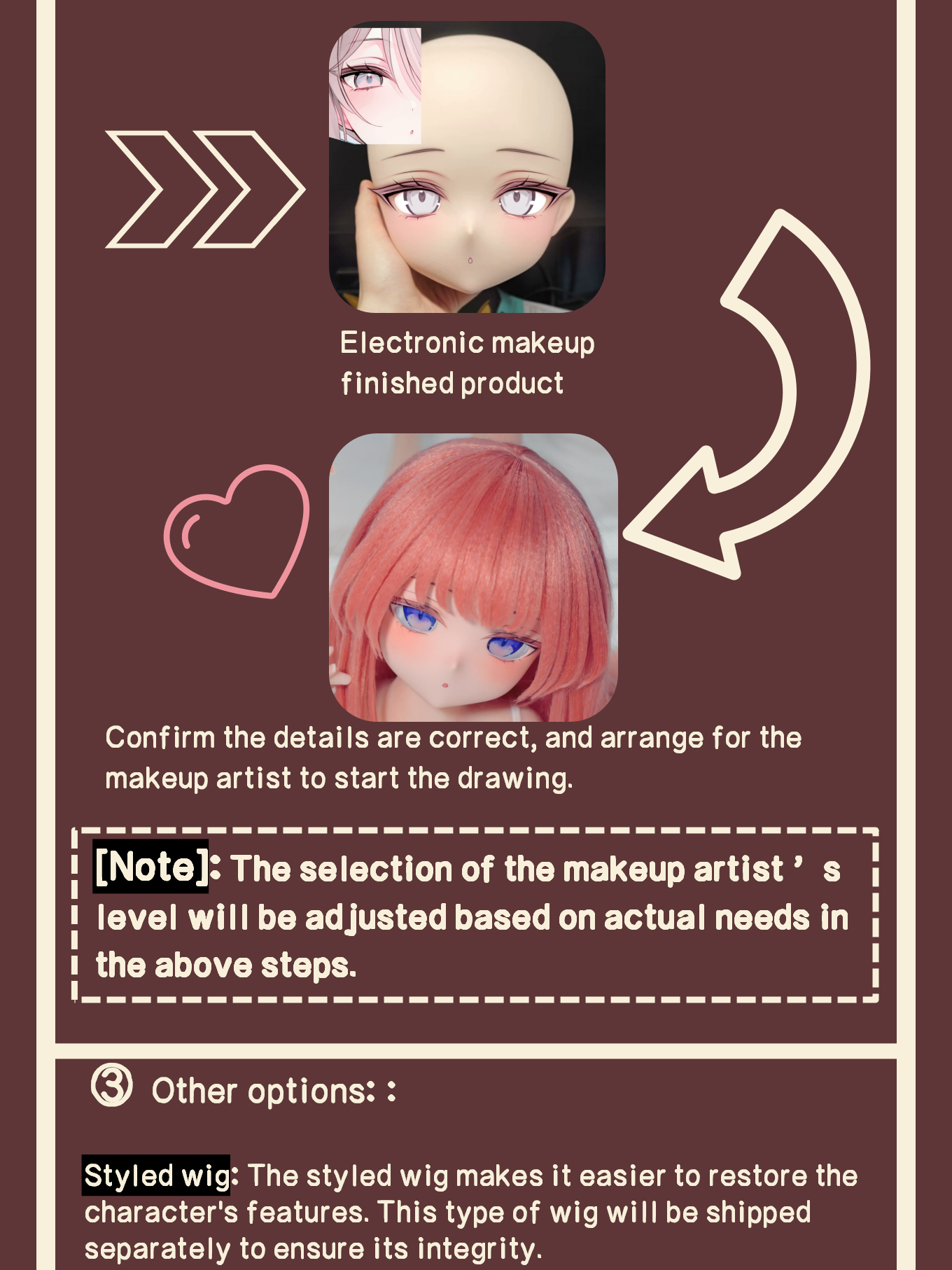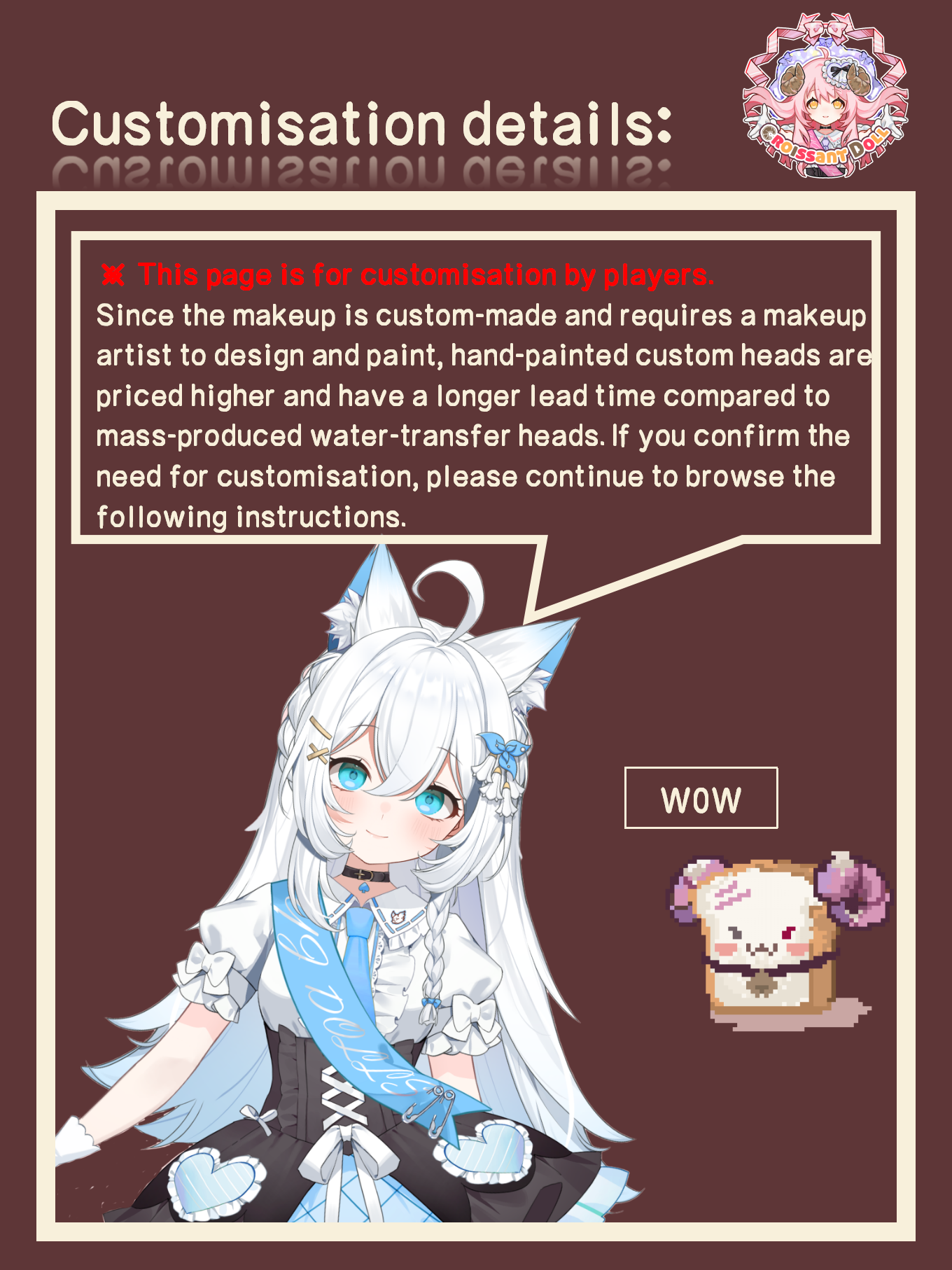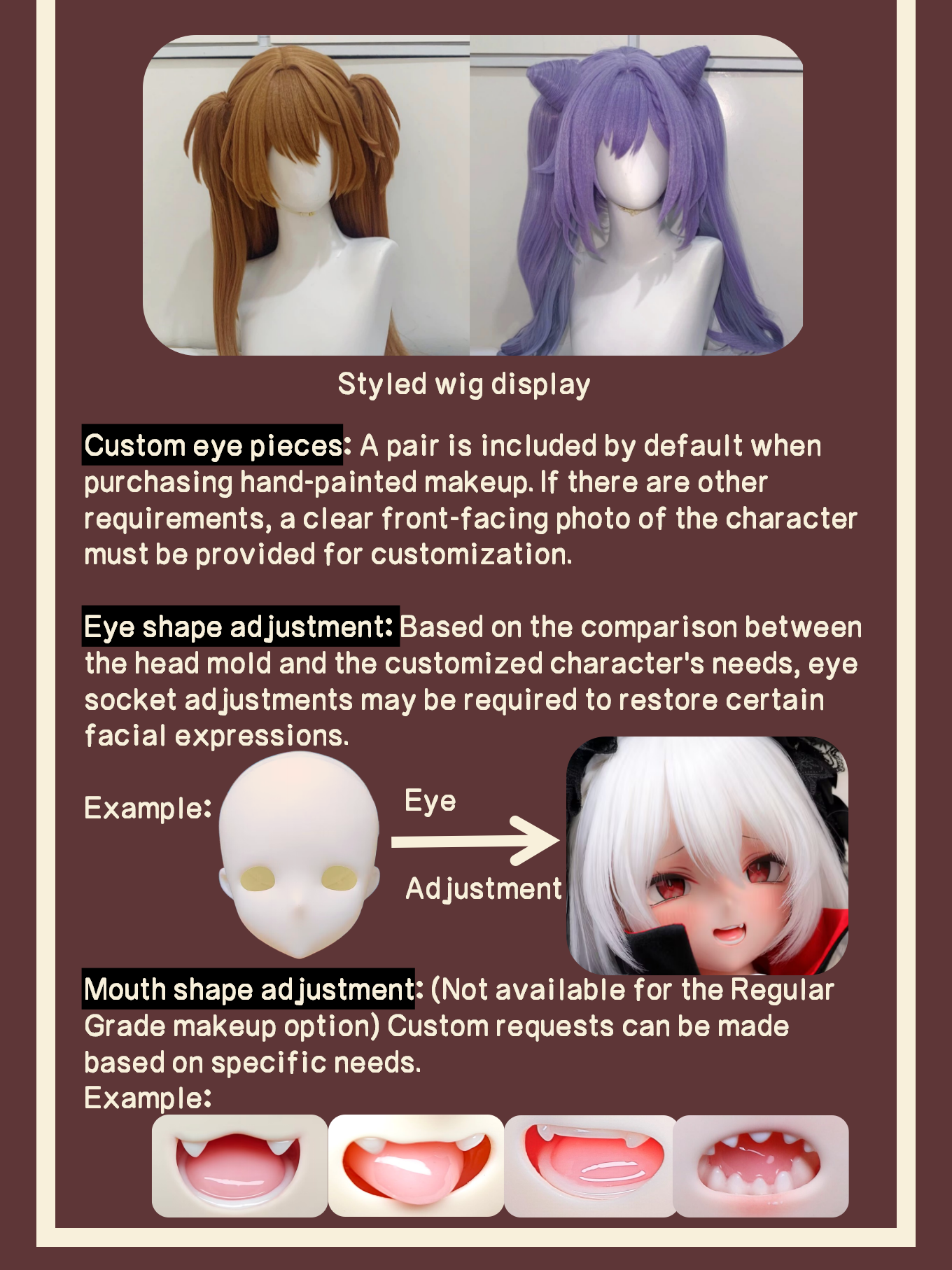 | Customization | Head Makeup(No adjustment), Head Makeup(Mouth adjustment), Head Makeup(Eye shape adjustment), Head Makeup(Overall adjustment), Pre-styled Wig, Custom-made clothing |